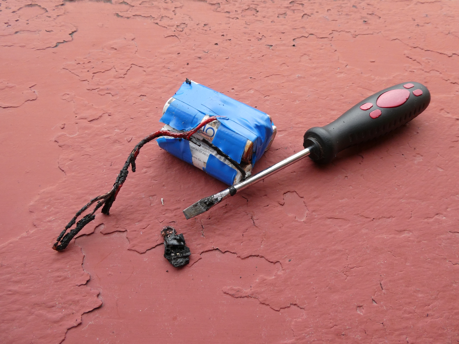 Když jsem z kufru vyndaval vysílač, abych ho po akci nabil, ucítil jsem zápach škvařícího plastu. Než jsem konkrétní místo odhalil, již k nebi stoupal dým, což mi obratem pomohlo najít správné místo. Přijímačový pětičlánek byl přes svůj servokonektor pevně spojen s plochým šroubovákem, který si vlivem cestování našel cestu skrz kapsu víka vysílače. Pokus o rozpojení rukou selhal, a tak přišly ke slovu nejbližší nůžky. Horký pětičlánek obratem letěl na okenní parapet. Po vychladnutí jsem vše vyfotil a šroubováky nyní budu převážet tak, aby i při proříznutí kapsy neměly k akumulátorům přístup.