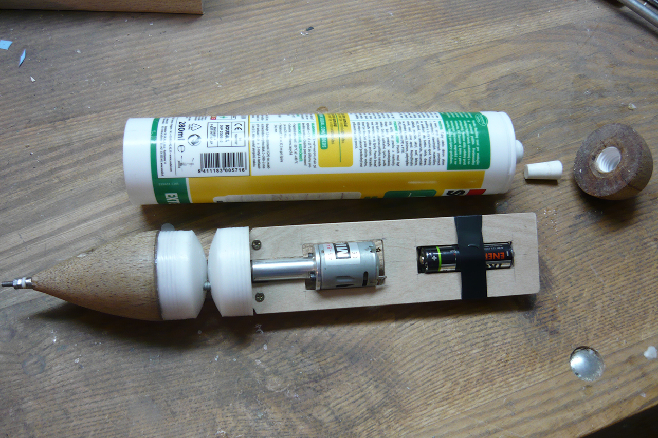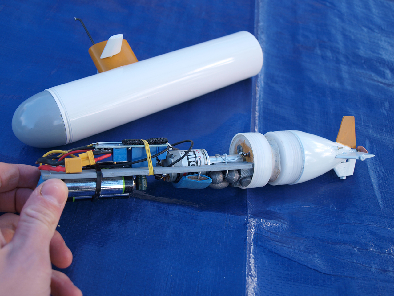 Rád bych se trochu pochlubil touto hračkou. Je to ponorka z tuby od tmelu, kterou jsem dělal přes vánoce. Pohon je řízen časovým spínačem a kormidla ručně stavitelná. Rc výbava by se vešla, ale nechtěl jsem. Různých postřehů a detailů ze stavby mám vlastně docela dost, ale o tom možná vyjde za čas tištětný článek, tak to nebudu do detailu rozebírat teď. Ale na dotazy rád odpovím, pokud by to někoho zajímalo. Prostě to vemte jako inspiraci a jako oživéní fóra :-)