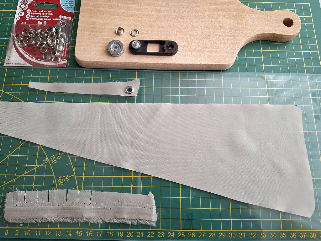 Říkal jsem si když plachta, tak z nějakého textilu, co udělat plachtu z nějaké syntetické tkaniny. Našel lehounkou podšívkovinu a vyzkoušel to vyřezat horkým hrotem páječky na skleněné tabuli.