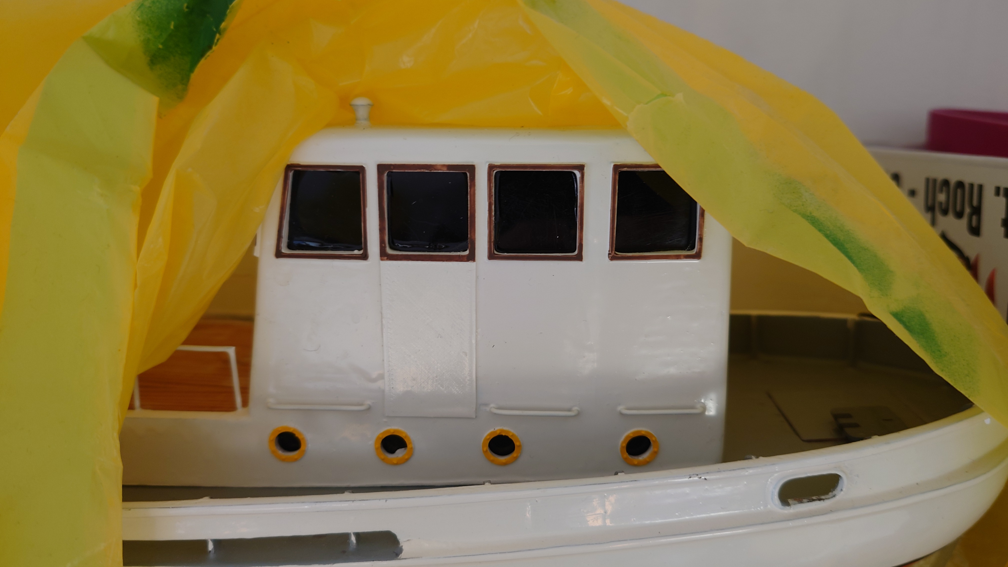 Montážku jsem zkoušel aplikovat i jiným způsobem, nafoukal jsem ji do igeliťáku, dobře zavázal a model na to posadil, nefungovalo to, nebyla vzdušná vhlkost na napěnění a vytvrdnutí. Tak jsem to obrátil a chráním trup a krabici, pěna je volně, aby vytvrdla a abych ji mohl ocákávat rozprašovačem.