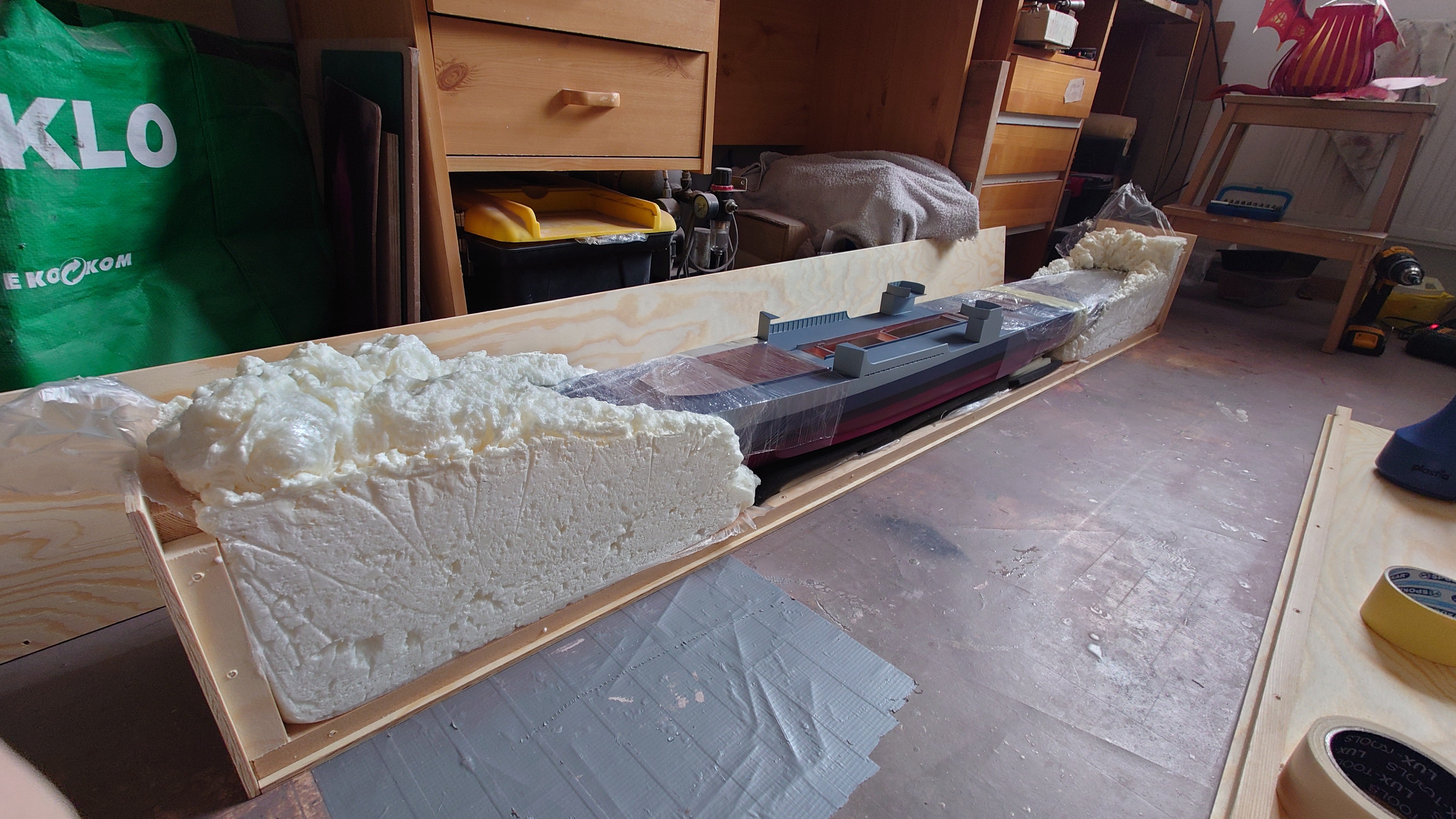 U malých lodí mám krabice s víkem a odklápěcí boční stěnou, pozici trupu fixuje akustický molitan (ten s těmi hrbolky), ale u takhle dlouhého trupu jsem volil pevnou vanu, kam trup posadím a on se zafixuje. kdybych byl schopen jednoduše a přesně vyřezat XPS polystyren do tvaru trupu (negativní forma), použil bych asi to.
